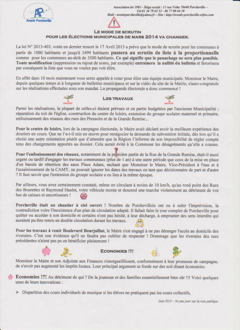 Vous avez dû trouver dans votre boîte aux lettres notre tract n° 5 axé sur le nouveau mode de scrutin pour les élections municipales de Mars 2014, les travaux réalisés à Porcheville, les économies !?! et la communication.
